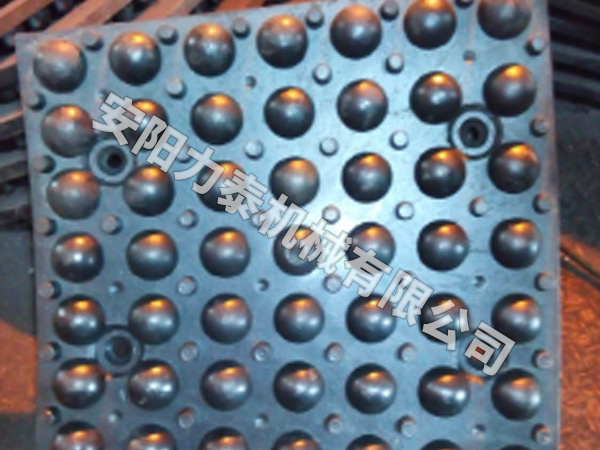 造球盤底襯安裝鑄石材料后,短期內(nèi)會在球盤底面形成一層底料,可以加速成球過程,但是在使用一段時(shí)間后,由于底料在生球不斷滾動(dòng)的作用下將變得越來越緊密,底料的溫度不斷升高,疏松的物料很容易粘附在其表面,使底料加厚,隨著底料的逐漸加厚,造球盤的負(fù)荷增加,同時(shí)由于鑄石板的自身比重較大,兩種負(fù)荷加在一起給球盤的傳動(dòng)部位造成很大阻力,致使傳動(dòng)部位的軸承、齒輪極易損環(huán),電耗增加,給生產(chǎn)和維修帶來很大麻煩,加大了維修工人的勞動(dòng)強(qiáng)度,提高了維修費(fèi)用,降低了生產(chǎn)效率。 根據(jù)我公司與燒結(jié)球團(tuán)行業(yè)的一些相關(guān)技術(shù)人員和專家的多方面交流以及我們多年來在制作球盤內(nèi)襯方面的一些經(jīng)驗(yàn)總結(jié),在球盤底部采用表面帶有圓柱體的高耐磨造球盤襯板。